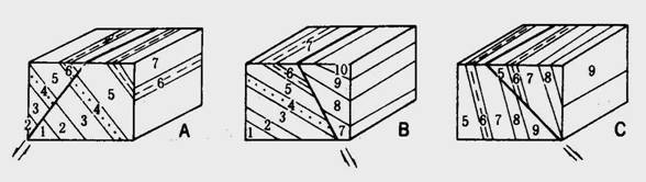 A、地层重复(断层与地层倾角相反) B、地层缺失 C、地层重复(断层与倾向相同)