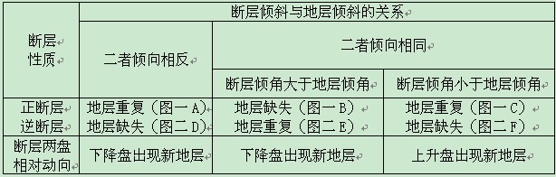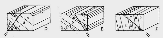 D、地层缺失(断层与地层倾角相反) E、地层重复 F、地层缺失(断层与倾向相同)