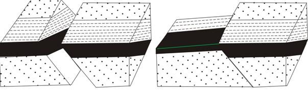 (2)地层缺失——断层与岩层倾向相同、断层倾角>岩层倾角。