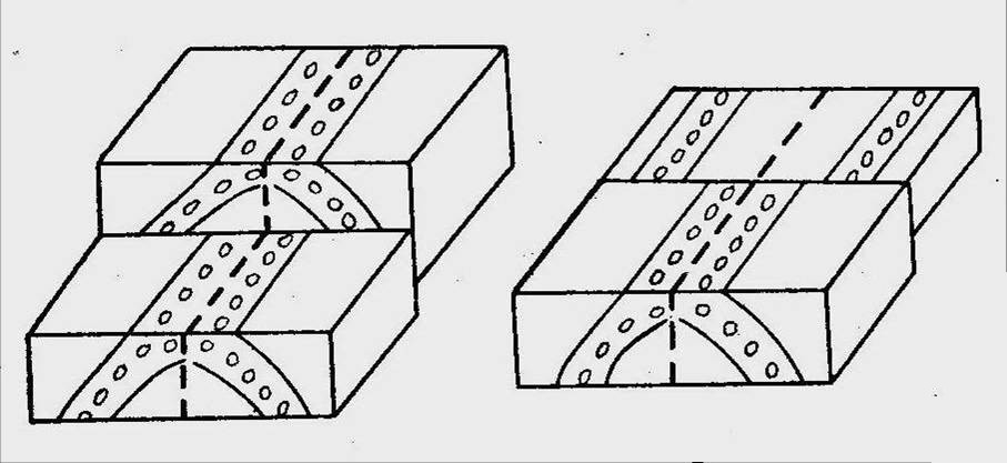 2.当横断层以正(逆)断层性质错断褶皱时,褶皱核部宽度产生变化错断正常背斜——上升盘核部变宽;下降盘变窄。错断正常向斜——上升盘核部变窄;下降盘变宽,如图九所示。