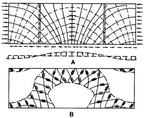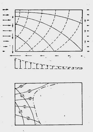 在这个构造应力场中形成应力不足以产生断层的中央稳定区和边缘稳定区。在这种应力场中形成的共轭剪切(逆)断层倾角中央部位较陡,两侧较平缓,如图十五所示。