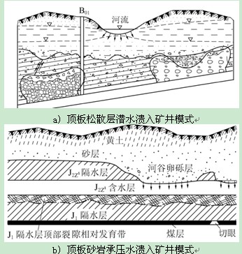a) 顶板松散层潜水溃入矿井模式