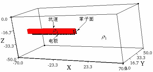 模拟过程中,设计巷道空间围岩电阻率ρ1为100Ω•m,巷道内空气实为无穷大电阻率值ρ2,便于模拟,采用有限电阻率值10000Ω•m代替,图一为模型构建示意图。