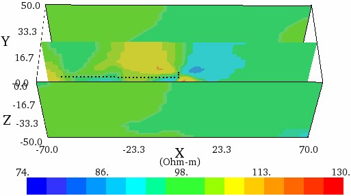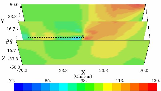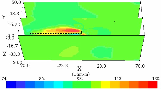 将巷道视为背景,通过模拟获得图二所示电阻率分布结果。可见,巷道所在区域表现明显的高阻特征,其它区域基本与模型真电阻率值100Ω•m相当,表明数值模拟结果与所建地电模型相同,数值模拟方法有效。