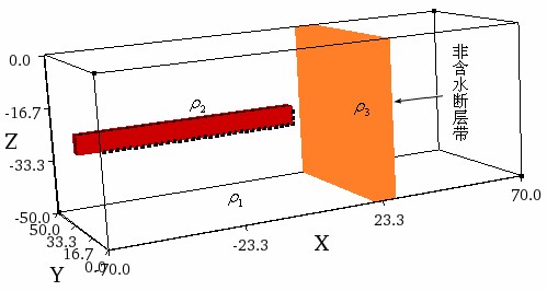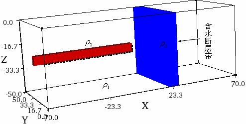 在背景模型基础之上,加载一断层模型,其x轴分布中心位置为20m处,宽度10m,y轴和z轴方向全部延展。当断层导水时,给定断层模型电阻率值为10Ω•m,不导水时为1000Ω•m,使两者与背景电阻率值的比例系数保持相同。图三和图四分别为具体的模型示意图。