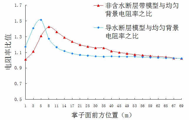 图七 断层模型的后方电阻率与均匀背景电阻率比值