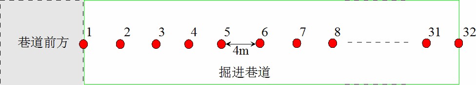 现场观测系统布置时,从迎头向巷道后方共布置32个电极,相邻电极距为4m,测线长度为124m,具体如图九。
