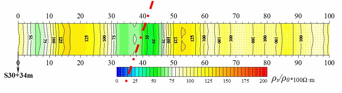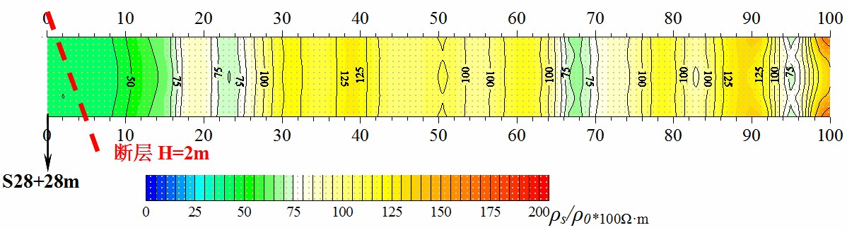图十和图十一分别为S28+28m和S30+34m掌子面直流电法超前探测结果。其中S28+28m掌子面处,现场施工时可见岩层破碎,顶板有淋水,地质分析为断层破碎带含水,但其延伸范围在探测之前还不确定,经直流电法超前探测,认为前方15m范围为其影响带,巷道掘进过程中顶板均有淋水。实际掘进验证,巷道前方16m顶板一直有较大的淋水,与探测结果基本吻合。随着巷道掘进,在S30+34m处,实施第二次超前探测,据图十一结果显示在30-50m段相对视电阻率值小于50Ω•m,按照含水判定标准,认为该区将有较大的淋水。据该结果,矿方组织钻探验证,现场钻深80m,钻探结果认为巷道前方80m范围无异常,便持续快速掘进,当至30m处,顶板开始滴淋水,随巷道陆续进入物探含水区,顶板淋水渐增,对巷道支护造成了影响,致巷道掘进放缓或暂时停止,优先加强排水。