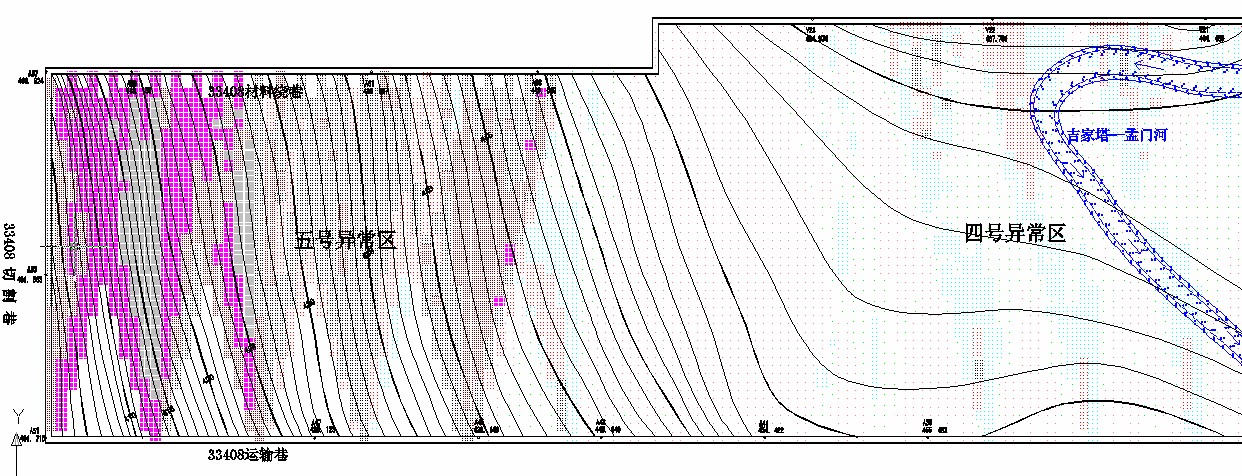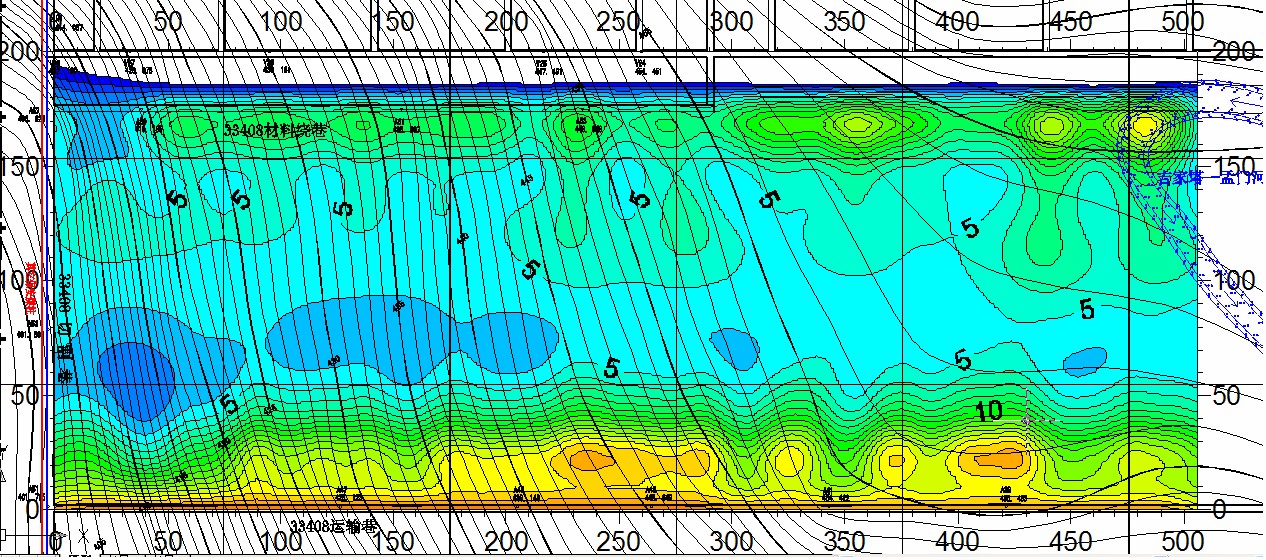 1、通过瞬变电磁法对33408工作面切割巷至切割巷退后530米范围内的富水情况进行调查;