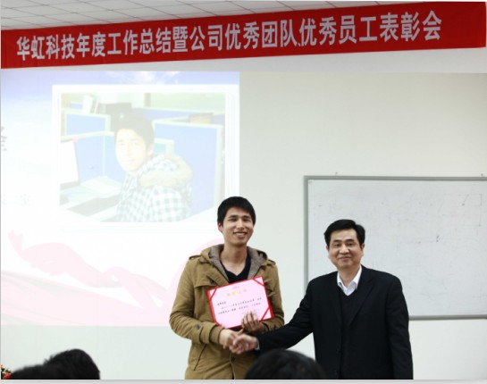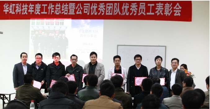 2012年,公司上下精诚团结,开拓创新,涌现出众多优秀人物和先进事迹。为了总结经验,表彰先进,激励广大员工争先创优,公司在员工自荐、部门推荐的基础上,经过评委会综合考评,共评选出2012年度优秀员工9名,优秀新人5名,优秀团队2个。2013年2月23日下午,公司召开“华虹科技2012年度工作总结暨优秀员工、优秀团队表彰大会”。陈春江董事长对获奖者表示祝贺,并说:“因名额限制,还有许多优秀员工未能上榜,所评选出的只是他们当中的代表,希望未接受表彰的员工不要气馁,立足本职工作,在新的一年里再接再厉,以良好的工作状态和优异的工作业绩来展示自己的实力。同时希望接受表彰的优秀员工戒骄戒躁、再接再厉,以实际行动在新的一年里创造新的业绩,为全面实现公司2013年经营目标齐心协力,共同奋进。”