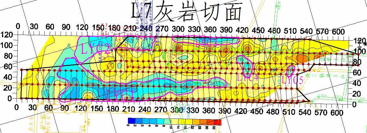 图五 庚三皮带下山底板下L7灰岩层位测网提取及结果图
