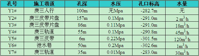 针对探测结果所圈定异常区,矿方共布置Y1#~Y2#七个探水钻孔,钻孔出水情况见表一 庚三皮带下山周边探水孔一览表,并且矿方根据本次探测结果及钻孔验证结果设计了相关的防治水方案。