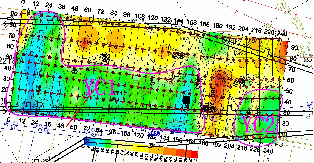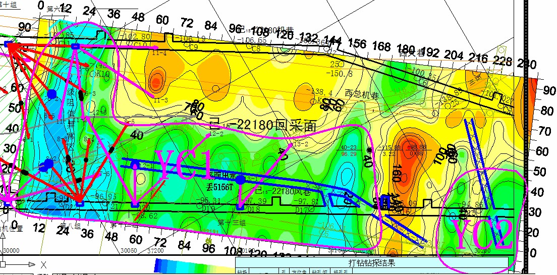 为了探查己二泄水巷顶板小窑水仓积水情况,为打钻放水提供靶区,特利用己二泄水巷单巷空间采用单巷多方向联合反演施工方法对己二泄水巷顶板上小窑水仓富水区进行评价。施工方案及探测结果详细见图九和图十。图十探测结果图中共圈定YC1和YC2两个相对低阻异常区。