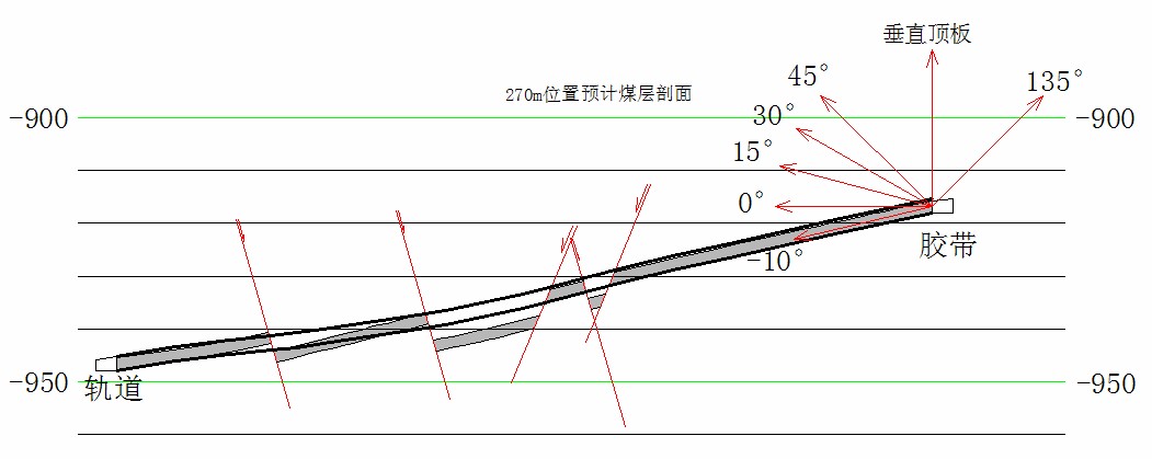 从现场情况获知,水源主要来自采空区顶板方向,因此现场设计的探测方向主要是朝向采空区顶板上方。数据采集区域为13301工作面胶带顺槽初始切眼和胶带顺槽交叉点开始退后的860m范围内,如下图二所示。