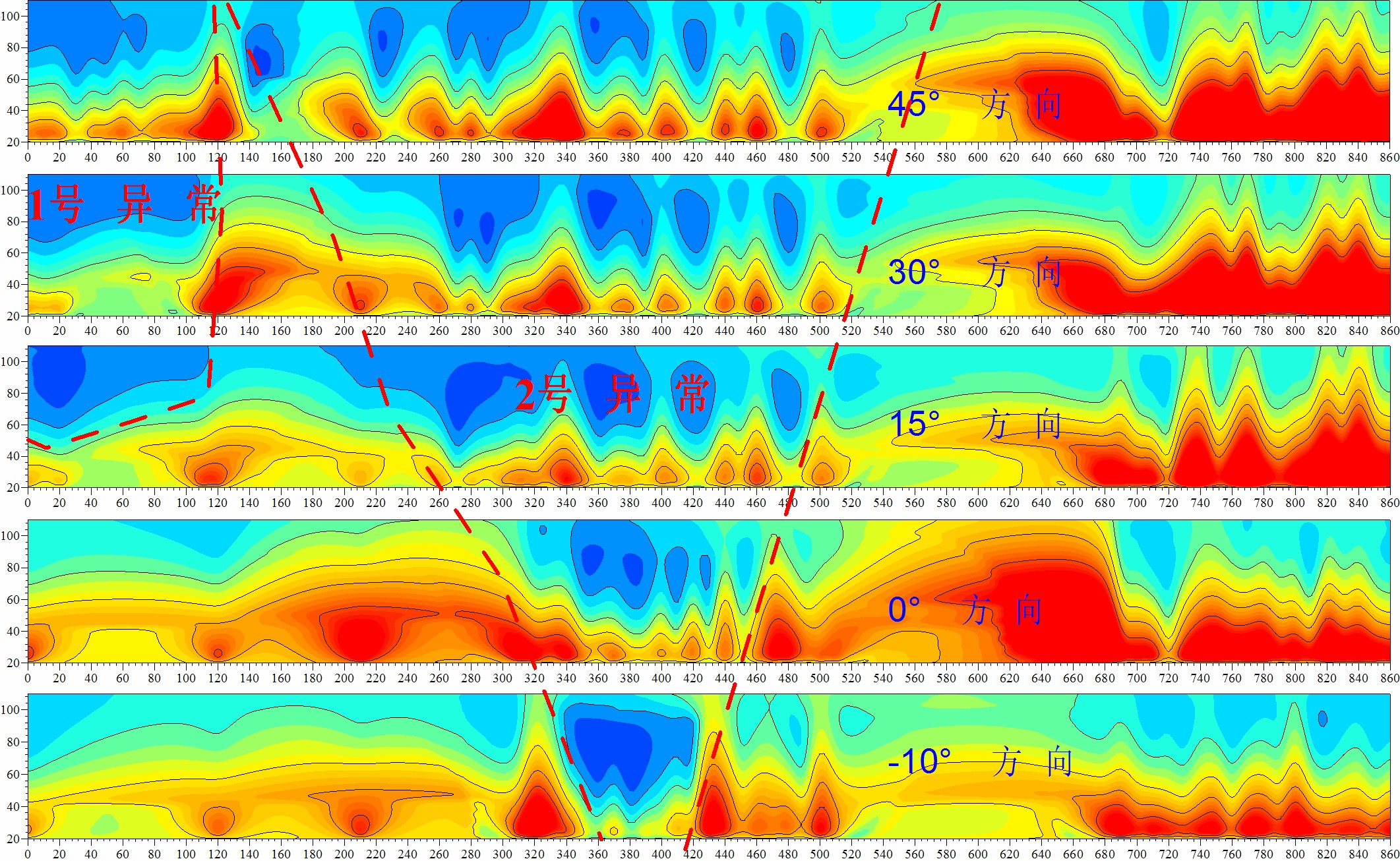 如图四所示,分别为13301工作面胶带顺槽工作面内-10°(与水平方向夹角)、0°、15°、30°、45°方向的视电阻率拟断面图,结果显示共存在2处低阻异常,分别为1号、2号异常区。1号、2号异常区域由-10°方向向45°方向低阻异常范围逐步变大,在这两处低阻异常区段中,2号异常视电阻率值更低,2号异常范围在空间分布上从-10°方向的340~420m区段向45°方向的140~520m区段扩大,为本次胶带顺槽探测区段内的主要异常。推断2号异常主要是受煤层采动及地质构造影响,煤层顶板砂岩裂隙发育,并与工作面形成水力联系导致相对富水。1号异常影响范围较小,推断该异常为砂岩局部裂隙发育所致,含富水性相对较弱。