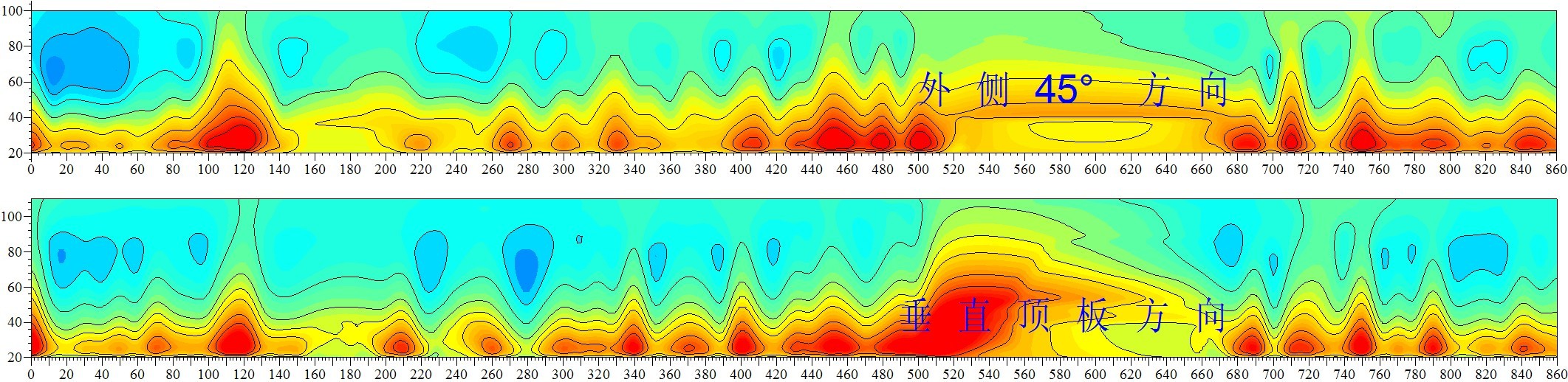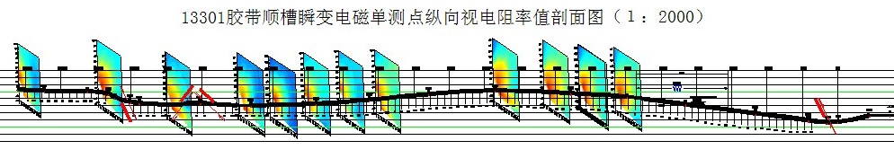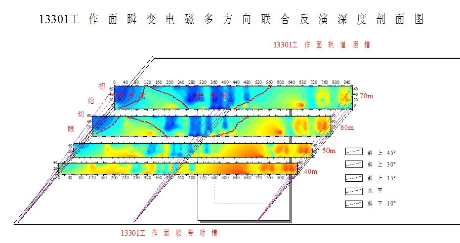 通过矿井瞬变电磁专业软件处理后,得到13301工作面胶带顺槽探测的多个方向的视电阻率拟断面图,图中不同的颜色代表不同阻值的变化,表示探测方向的一定深度上电性横向变化的情况,遵循从冷色调到暖色调表示阻值从低到高变化的一种趋势。
