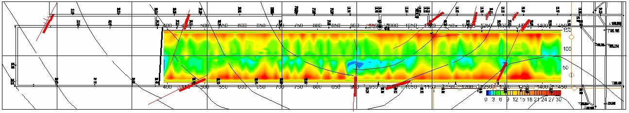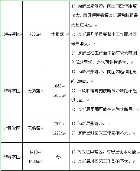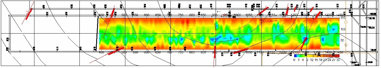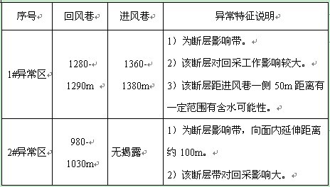 探测结果中判断断层位置与矿方资料基本一致的,在此次探测报告中仍以矿方实测资料为准。坑透异常区均与实际揭露的断层位置相对应,说明此次探测获得的数据真实可靠。