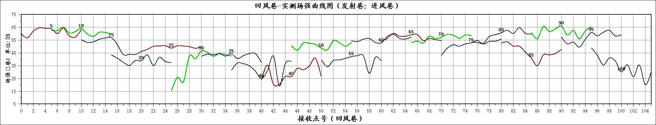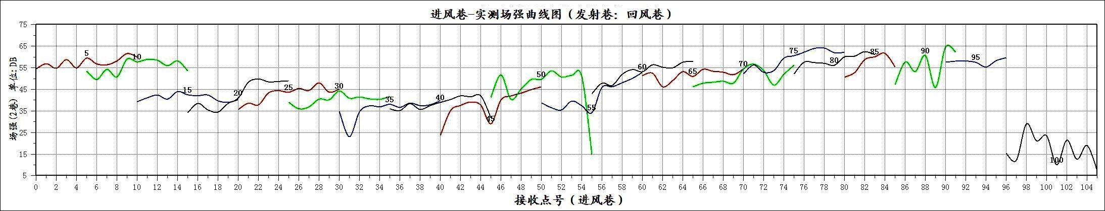 YDT88矿用无线电波透视仪探测实测场强曲线图见由附图一,其中实测场强曲线代表每一个发射点到对应的各个接收点见电磁波能量大小,实测场强大的表示传播路径上岩体吸收能力弱,实测场强小的表示传播路径上岩体吸收能力强。
