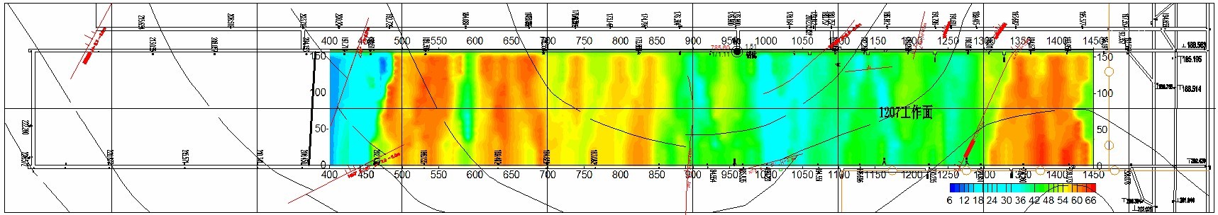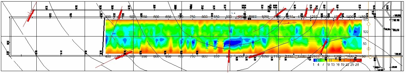 附图三为YDT88矿用无线电波透视仪探测SIRT反演煤岩层吸收系数成像图。该图中吸收系数的强弱表明煤层介质的差异,图中红色色标表示强吸收系数值,其红色色越深表示存在异常的可能性越大,因此可以对内部构造及其特征进行判定。
