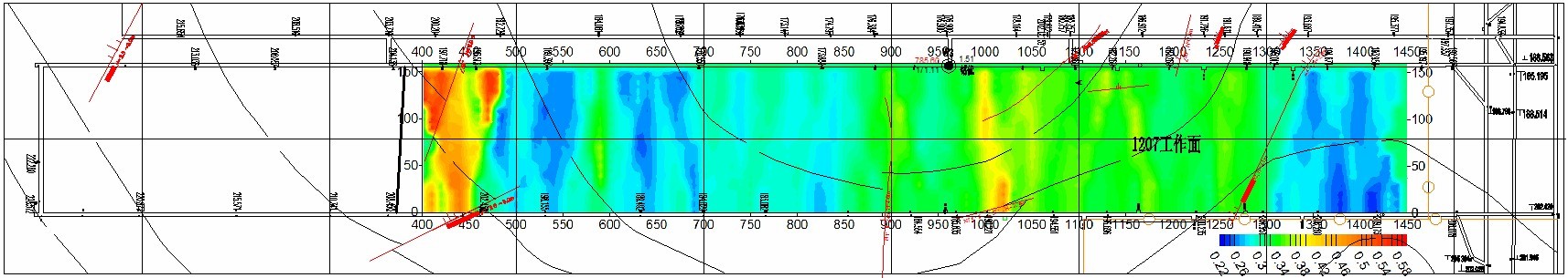 附图五 YCS256瞬变电磁探测工作面内顶板视电阻率分布图