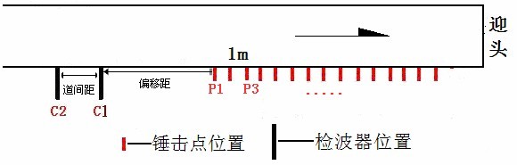 本次实验在2012年9月27日进行,分别在新二采区轨道巷和207运输巷掘进巷道进行,观测系统采用双检波器同侧后置,检波点和锤击点均布置在巷道右侧帮,如观测系统示意图四所示。