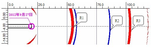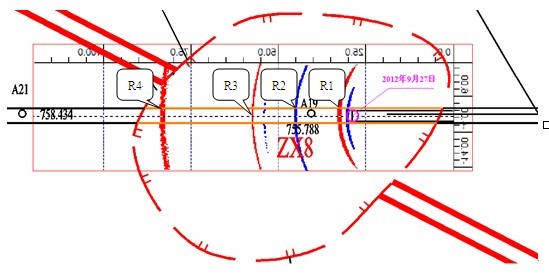 新二采区轨道在掘进过程中,在右帮G11点前105.8m,左帮G11点前110.8m位置揭露陷落柱,与R1位置基本吻合;在右帮G11点前151.7m,左帮G11点前147.1m左右出陷落柱,与R3位置基本吻合,详细见图七。