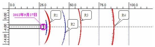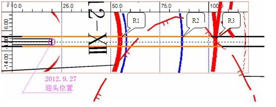 图五为新二采区轨道巷经过深度偏移后反射界面提取图,根据该成果图分析在迎头前方34-39m(即G11点前100-105m)左右范围存在一强反射界面界面,为R1,推断其为迎头前方陷落柱边界或是断裂构造发育带;在迎头前方62m(即G11点前128m)左右位置存在一较强反射界面,为R2,推断其为破碎带或裂隙发育带;在迎头前方77-80m(即G11点前143-146m)左右范围存在一强反射界面,推断其为迎头前方另一陷落柱边界或断裂构造发育带。