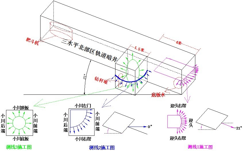 该巷迎头底板存在少量积水,迎头后退20m左右存在耙斗机。受底板货物堆积及巷高限制,迎头位置仅顺巷道倾角-21°方向布置1条测线,命名测线1,自左帮开始共15布置个测点,角度分别为0°、15°、30°、45°、60°、75°、90°、90°、90°、105°、120°、135°、150°、165°、180°。