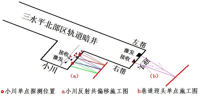 本次应用地震波反射法中单点法与反射共偏移法对前方构造发育情况进行探测,主要在暗井巷道迎头与小川前端进行施工布置,施工示意图如图2。