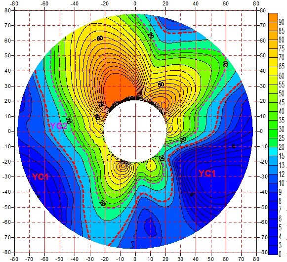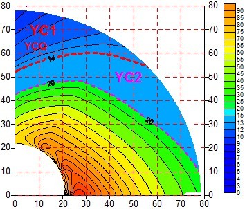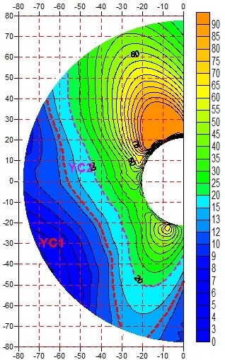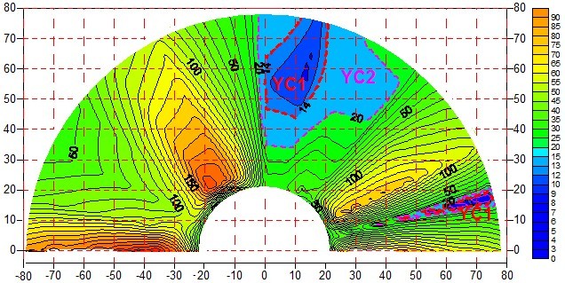 本次在进行数据处理时用不同的色调表示不同的视电阻率值,并随色调由冷到暖变化,视电阻率值逐渐增高。结合南山煤矿地质特性、探测位置岩性特点、视电阻率剖面图中阻值大小与变化特性等,将可能存在富水异常的区域分为两个等级,即YC1、YC2,YC1代表富水性较强,YC2代表富水性相对较弱,当视电阻率值小于14Ω•m时划为YC1,视电阻率值在14Ω•m~20Ω•m时划为YC2,视电阻率值大于20Ω•m时,认为富水性很弱。