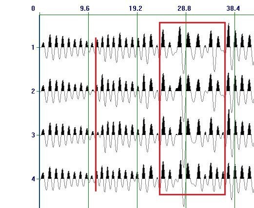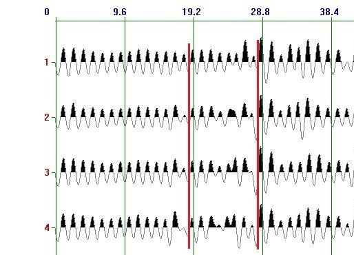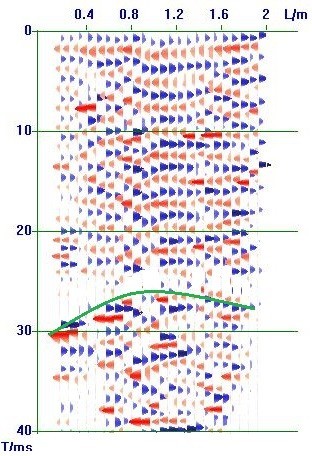 根据经验与南山煤矿地质特性,在对地震波反射数据进行分析时,岩层中地震波综合波速采用3.0m/ms,破碎带位置采用1.5m/ms,并对每个检波器在每个测点上的接收的所有地震波,包括通道增益24DB、36DB、48DB在内的地震波一起进行综合分析。