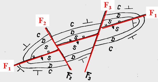 斜断层:断层走向与褶皱轴向或区域构造线斜交( F3 ),如图五所示。