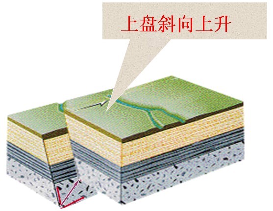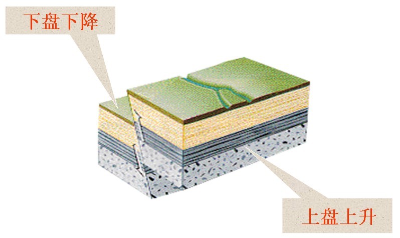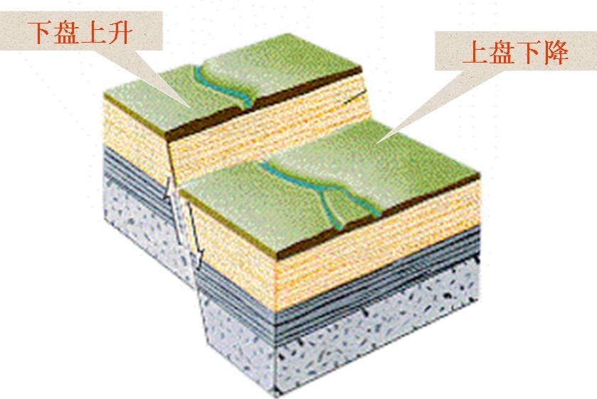 断盘:断层面两侧沿断层面发生位移的岩块。如果断层是倾斜的:位于断层面上侧的一盘为上盘,位于断层面下侧的一盘为下盘,如图一所示。如果断层是直立的,则可按断盘相对于断层走向的方位描述,位于断层面东侧的一盘为东盘;位于断层面西侧的一盘为西盘,同理还有南盘、北盘。如果根据断层两盘相对滑动情况,则将相对上升的一盘叫上升盘,相对下降的一盘叫下降盘。