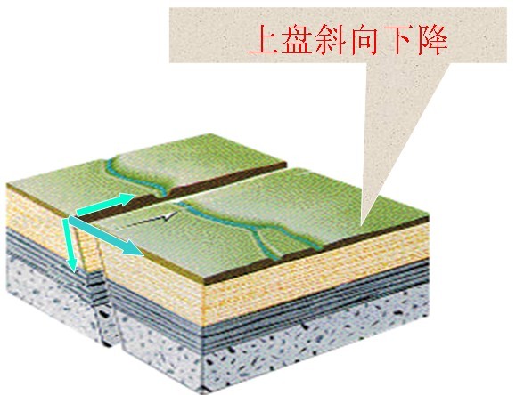 1 、正断层:上盘相对下盘向下滑动的断层,如图六所示。
