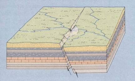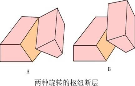 6、枢纽断层:以断层面上任意一点为中心做旋转运动(位移)的断层。该类型断层的特点是:断盘上任意点的位移量均是不同的——与旋转中心距离呈正比。当旋转中心(轴)位于断层一端(消失点)时,表现为横过断层走向的各个剖面的位移量不等;当旋转中心(轴)位于断层中心时,表现为旋转中心(轴)两侧的相对位移不同——一侧为上盘上升、一侧上盘下降。