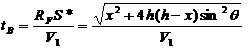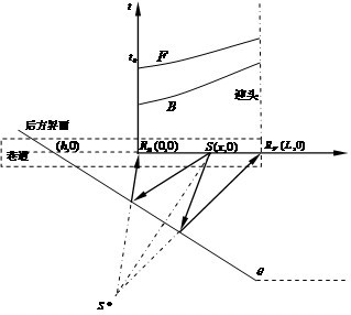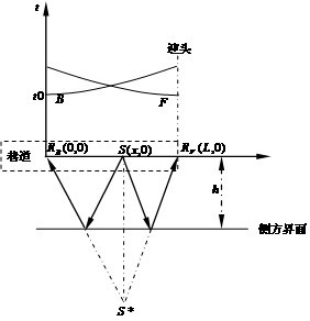 研究反射波的时距曲线特征需首先建立观测系统坐标系。由于受地下工程的空间局限性,巷道地震探测工作只能在巷道迎头附近有限区域展开。因此,结合实际,坐标系的X轴原点位于巷道后方,X轴正方向水平指向巷道前方;接收点分别设置在原点和迎头位置,激发点位于原点与迎头之间。设巷道前方界面在X轴上出露点为(h,0),界面倾角为θ,后置接收点位于原点RB(0,0),任一激发点的坐标为S(x,0)(图一)。根据反射定律和虚震源原理可得巷道前方界面的时距方程如下:
