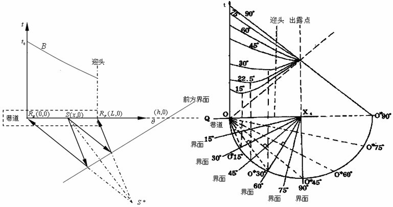图一 巷道前方倾斜界面反射波时距曲线 图二 前方不同倾角界面时距曲线对比