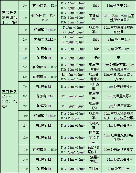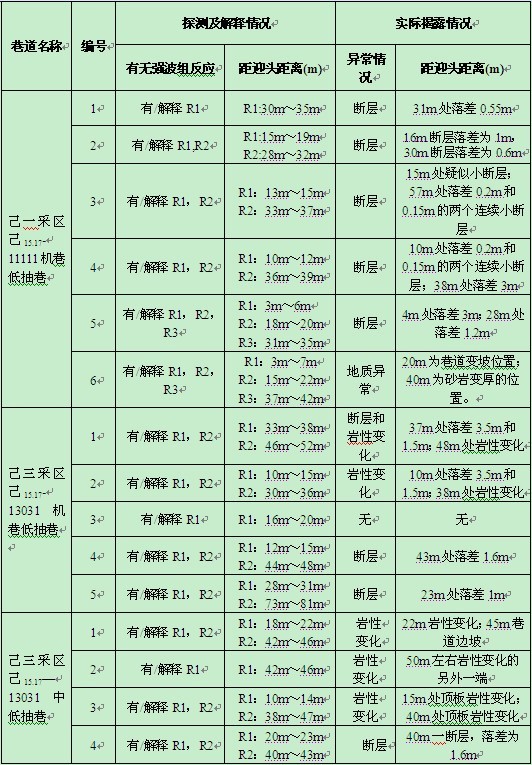 准确预测45个(己15.17-11111机巷低抽巷11个,己15.17-13031机巷低抽巷6个,己15.17-13031中低抽巷跟踪探测8个(其中一个还未揭露),东翼回风下山跟踪探测3个,己15-14010机巷跟踪探测17个)。即掘进工作面前方断层破碎带、煤厚变化带、岩性变化带、褶皱等地质构造探查准确率为81.8%。