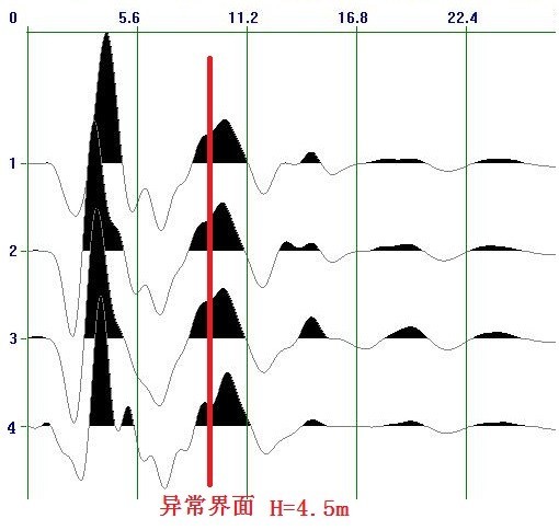 根据底板反射共偏探测波形数据,利用地震数据处理软件进行解析,由结果图(图五)可知,在距底板4.3m处存在一波形异常界面,推测为3#煤层。