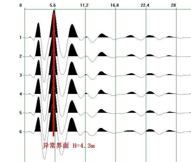 根据顶板单点探测波形数据,利用地震数据处理软件进行解析,由结果图(图二)可知,在距顶板4.44m存在一个波形异常界面,推测为2上#煤层界面。