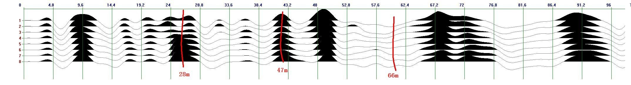 根据图中震波信号分析,共有三处反射异常界面,其中异常界面一距离当日迎头前方28m位置,分析为构造或裂隙发育带;异常界面二距离当日迎头前方47m位置,反射波能量较强,推测为构造或者裂隙发育。异常界面三距离当日迎头前方66m位置,该构造影响范围大,推测为构造带。