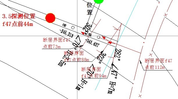 异常界面二:在图上可知在探测位置前的45m为一个走向302°,倾角70°,落差1m的断层;在图上可知在探测位置前的50m有一个走向282°,倾角47°,落差7m的断层;