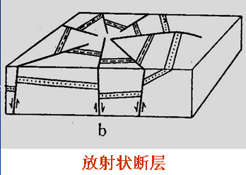由若干条正断层自一个中心向外成辐射状排列之组合。这种构造组合型式形成是隆拱作用引起的平面引张之结果,规模一般不大,以小型为主。