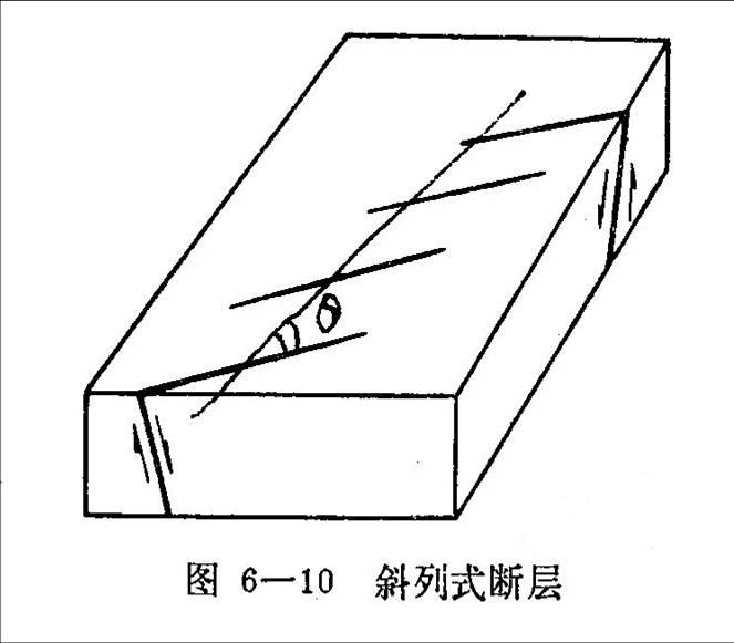 斜列型断层构造是由若干条彼此平行的正断层呈斜向错列之组合。单条断层与斜列式断层带(串连线)走向呈30°~ 45°斜交。