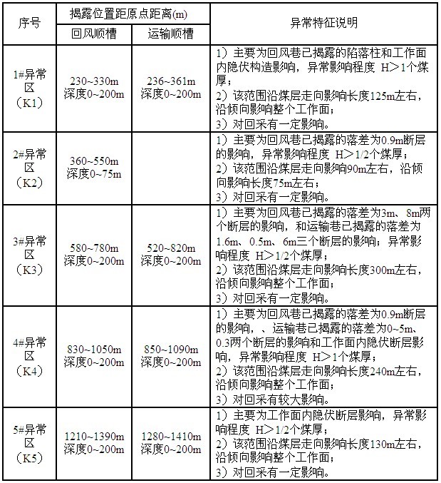 运输顺槽揭露断层7条断层,分别为:F1落差为2m,倾角38°,向工作面内延伸和Z1#异常范围相吻合;F2落差为1.6m,倾角48°,F3落差0.5m,倾角45°,向工作面内延伸和Z6#异常范围相吻合;F4落差6m,倾角50°,向工作面内延伸和Z7#异常范围相吻合;F5落差3m,倾角73°,向工作面内延伸在Z11#异常范围内;F6落差0.3m,倾角30°,向工作面内延伸和Z12#异常范围基本吻合;F7落差5.4m,倾角50°,向工作面内延伸在Z17#异常范围内;回风顺槽揭露7条断层,分别为:F8落差为2.2m,倾角42°,F9落差为0.8m,倾角58°,F10落差2m,倾角67°,此三条断层相距较近,向工作面内延伸在Z16#异常范围内;F11落差0.5m,倾角30°,向工作面内延伸和Z15#异常范围相吻合;F12落差0.9m,倾角60°,向工作面内延伸在Z11#异常范围内;F13落差3m,倾角35°,向工作面内延伸在Z8#异常范围内;F14落差0.9m,倾角40°,向工作面内延伸和Z5#异常范围相吻合; 工作面内揭露的隐伏断层为4条,分别为:F15落差8m,倾角48°,向工作面内延伸在Z8#异常范围内;F16落差4m,倾角70°,向工作面内延伸和Z10#异常范围相吻合;F17落差3m,倾角80°,向工作面内延伸和Z11#异常范围相吻合;F18落差5m,倾角70°,向工作面内延伸和Z14#异常范围相吻合;运输顺槽已揭露陷落柱2个,分别为:DX1向工作面延伸和Z2#异常范围基本吻合;DX4向工作面延伸和Z16#异常范围基本吻合;回风顺槽已揭露陷落柱1个,为DX5向工作面延伸和Z4#异常范围基本吻合;工作面内揭露的隐伏陷落柱3个,分别为:DX2向工作面延伸和Z2#异常范围基本吻合;DX13向工作面延伸和Z2#异常范围基本吻合;DX6向工作面延伸和Z9#异常范围基本吻合。