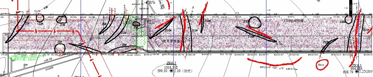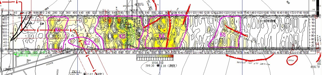 DX2和DX5向工作面延伸范围在无线电波透视异常区K1内;F14向工作面延伸范围在无线电波透视异常区K2内;F2、F3、F4、F13、F15、DX6向工作面延伸范围在无线电波透视异常区K3内;F5、F6、F12、F16、F17向工作面延伸范围在无线电波透视异常区K4内;DX3和F18向工作面延伸范围在无线电波透视异常区K5内;F1、DX1、F11、DX4在无线电波透视法探测中均无异常反应。