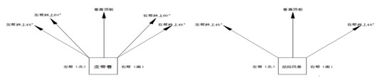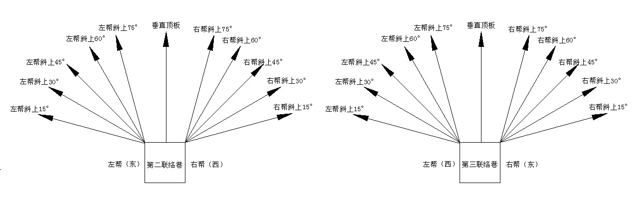 本次主要是探测仓顶冒落区附近M4砂岩含水层的导水情况,所以在皮带巷设计5个方向、总回风巷设计3个方向、第二联络巷及第三联络巷分别设计11个探测方向。现场测点布置为每2m一个测点,具体的测线布置如图3-1所示( 红色线条表示测线布置位置),单个测点布置方向如图3-2所示。