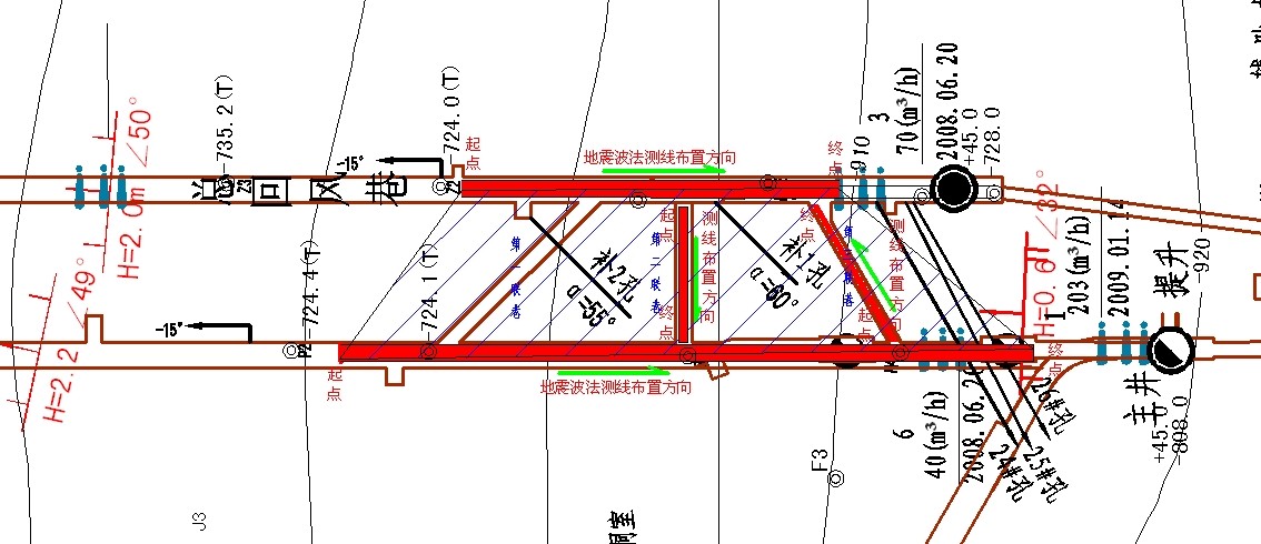 本次主要是探测仓顶冒落区分布范围,所以探测方向设计在皮带巷、总回风巷、第二联络巷及第三联络巷顶板位置。现场的测线布置如图3-3所示( 红色线条表示测线布置位置),探测施工方法如图3-4所示。