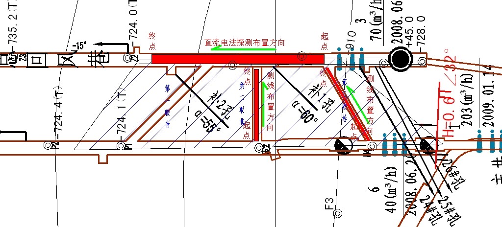 为了对瞬变电磁及震波探测结果的补充,在总回风巷、第二联络巷及第三联络巷布置直流电法探测,通过探测结果可以分析这些巷道的岩层电性的分布情况,来判断岩层的富水性。