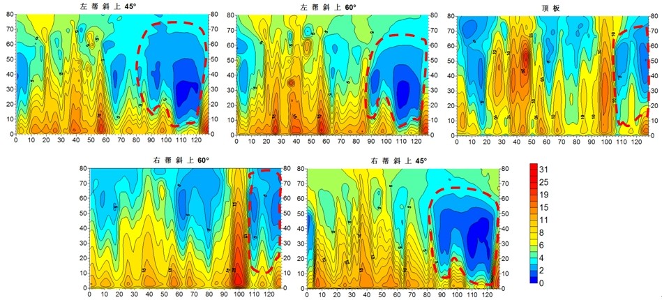 经数据处理、分析,获得皮带巷、总回风巷、第二联络巷及第三联络巷顶板岩层波组分布图,通过分析波组的分布特征来判断岩层的物理特性,可以反映出冒落区的影响范围。
